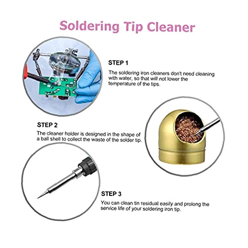 De kogelschaal basis is gemaakt van legering materiaal, duurzaam en veilig om bestand te zijn tegen werken in de hitte; Soldeertip reinigingsdraad bal is gemaakt van hoogwaardig messing, kan oxide accumulatie verminderen, de werkefficiëntie verbeteren en de levensduur van uw soldeerbout verlengen. De koepelhouder is bedoeld om de tinresten op te slaan en uw werkteller uit de rommel te houden.
